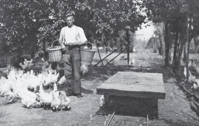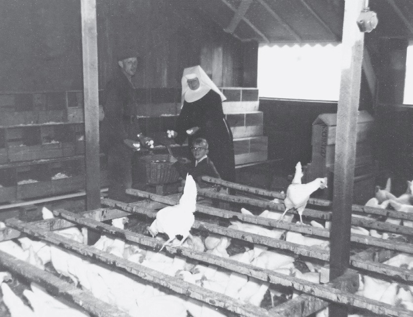 Klaas Groot met tantezuster. Goed zichtbaar zijn de stokken waarop de kippen 's nachts sliepen.