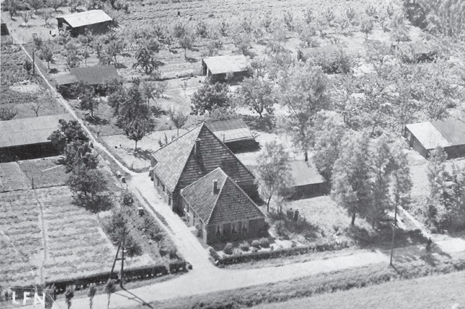 Op deze luchtfoto uit 1952 zien we het bedrijf van Hoogland aan het Groene Wuiver 4.