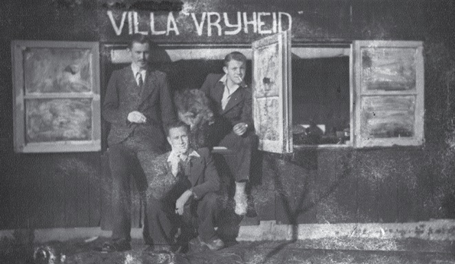 De onderduikers Klaas Appel, Jan Vet en Sam Stuifbergen in Villa Vrijheid.
