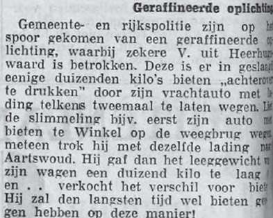 In januari 1938 werd van de weegbrug in Lambertschaag de balans met schuifgewicht gestolen. In november van datzelfde jaar bericht de krant over een oplichter die door te pendelen tussen de weegbruggen van Aartswoud en Winkel en te sjoemelen met de weegkaartjes zijn lading bieten te zwaar liet wegen. Deze heer V. uit Heerhugowaard werd gesnapt en ‘zal den langsten tijd wel bieten gewogen hebben op deze manier!’ Het materiaal, hout en ijzer werd onderhouden met koolteer. Ene heer Kemper deed die klus een keer, hij teerde echter ook het tegenblok (contragewicht). Trijntje was woedend, omdat hierdoor het evenwicht niet meer precies was.