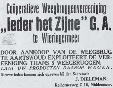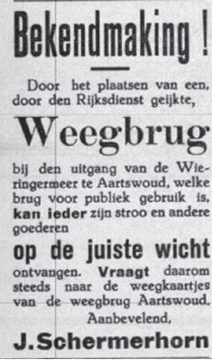 De brug had een weegvermogen van 20 ton en was 10 meter lang en had ‘een mooie oprit’. De Rijksdienst zou iedere een à twee jaar de weegbrug komen ijken. De Hoornse ondernemers plaatsten op 8 augustus een advertentie, zie hieronder.