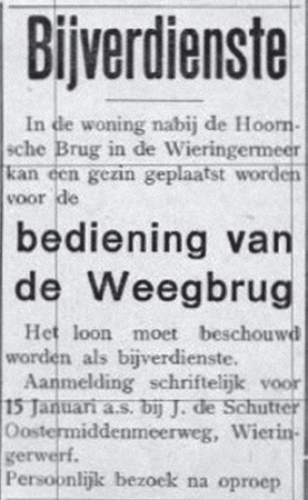 Het huisje was, net als de weegbrug, eigendom van de twee Hoornse ondernemers. Het inkomen van Trijntje lag niet erg hoog. Zoals een advertentie uit 1938 voor de weegbrug van Wieringerwerf aangeeft, moest het wegen als bijverdienste worden beschouwd.