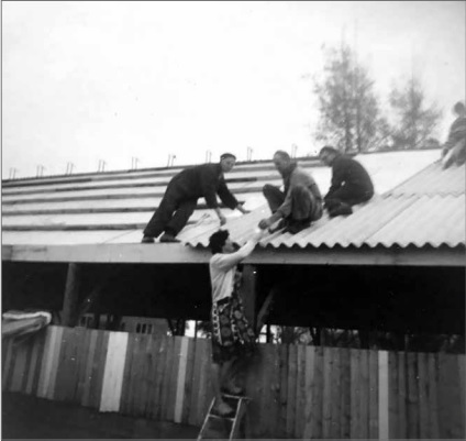 De bouw van de schuur van Dorus Koopman. Nelie geeft aan aan Dorus,