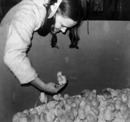 De eendagskuikens worden hier liefdevol opgetild door Trudie Jol.