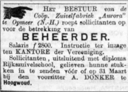 ‘Reeds geruime tijd bestond er bij een gedeelte van de veehouders in Opmeer en Omstreken de lust tot het oprichten van een coöperatieve zuivelfabriek’, zo begint het notulenboek van Aurora. Veehouder Adriaan Donker ging op verkenning en vond zeven gelijkgestemden, die op 30 december 1912 bijeenkwamen in café Kromhout te Opmeer.