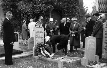 Kranslegging door het bestuur op het graf van Adriaan Donker, bij het 50-jarig bestaan van Aurora.