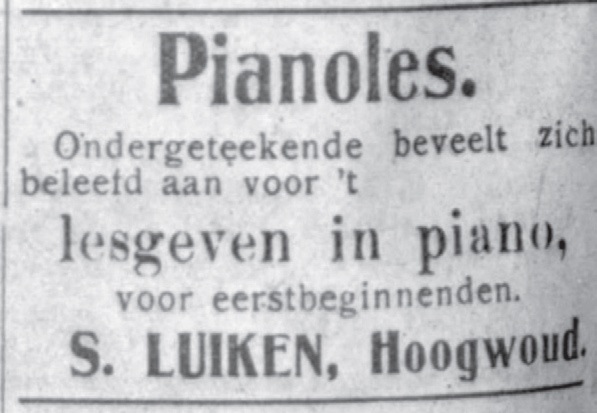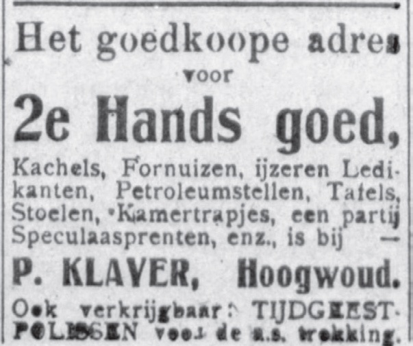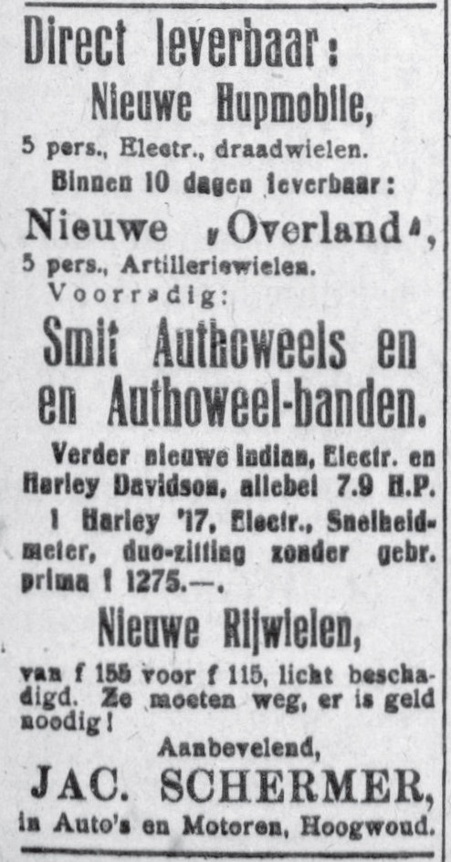 Auto’s, motoren, fietsen, stro, vlees, vis, sigaren, port, huishoudelijke artikelen, allerlei tweedehands spullen, pianolessen. Een kruidenier doet zijn zaak over, een visboer verkoopt draadnagels. Er was van alles in de aanbieding in de gemeente zo kort na de Eerste Wereldoorlog. De middenstanders adverteerden in streekbladen. Onderstaande advertenties zijn een selectie uit De Nieuwe Courant (DNC, Hoorn 1894 – 1939) en De Schager Courant (SC, bestaat nog).