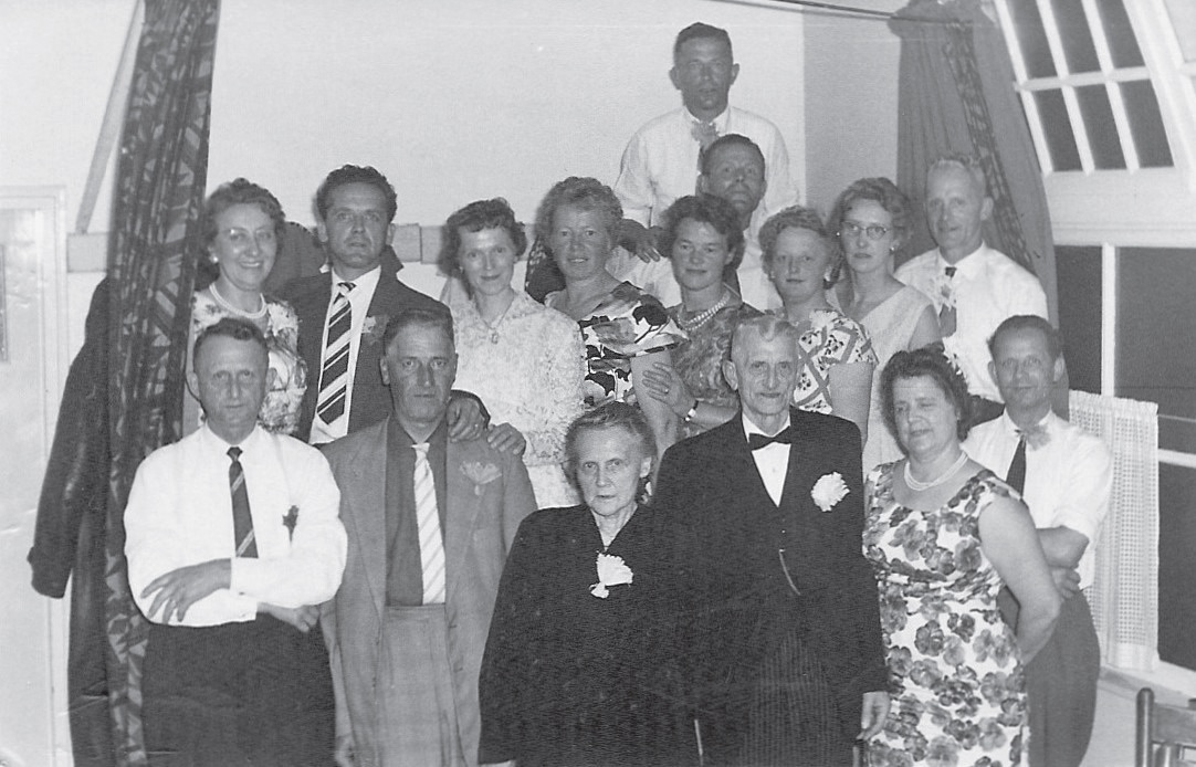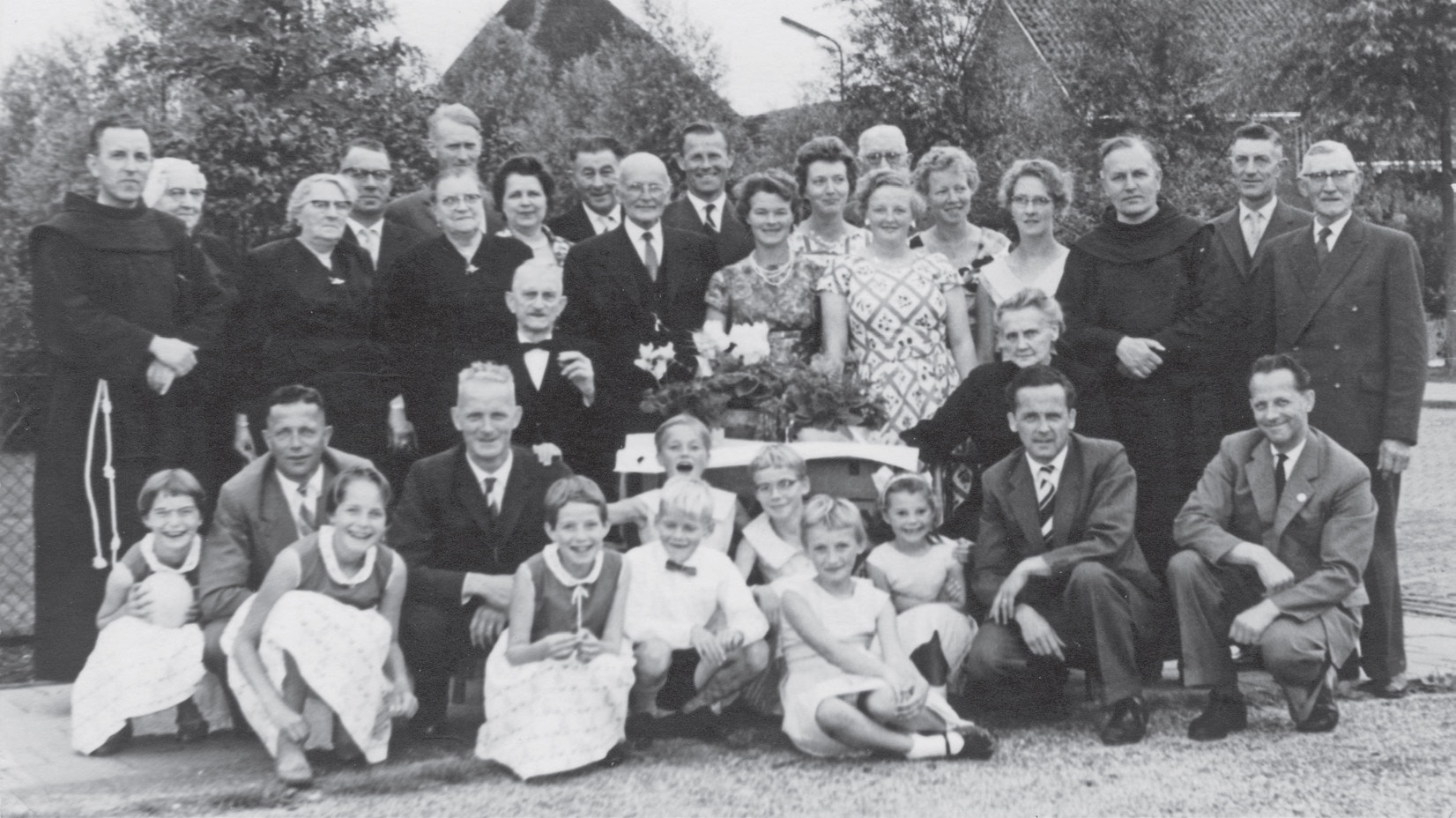 Het gezin Groot met kinderen, aanhang en kleinkinderen bij het vijftigjarig huwelijksfeest van Hannes en Jansie.