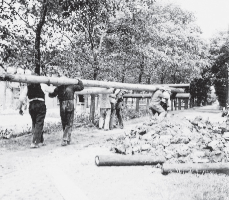 Het sjouwen van palen voor hoogspanningsmasten in Wormer.