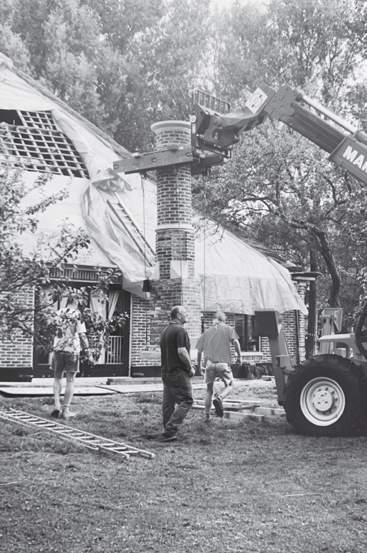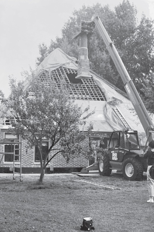 Het was nog wel spannend om de schoorsteen op zijn plaats te krijgen met een kraan, maar door voorzichtig manoeuvreren van de machinist is dat prima gelukt.