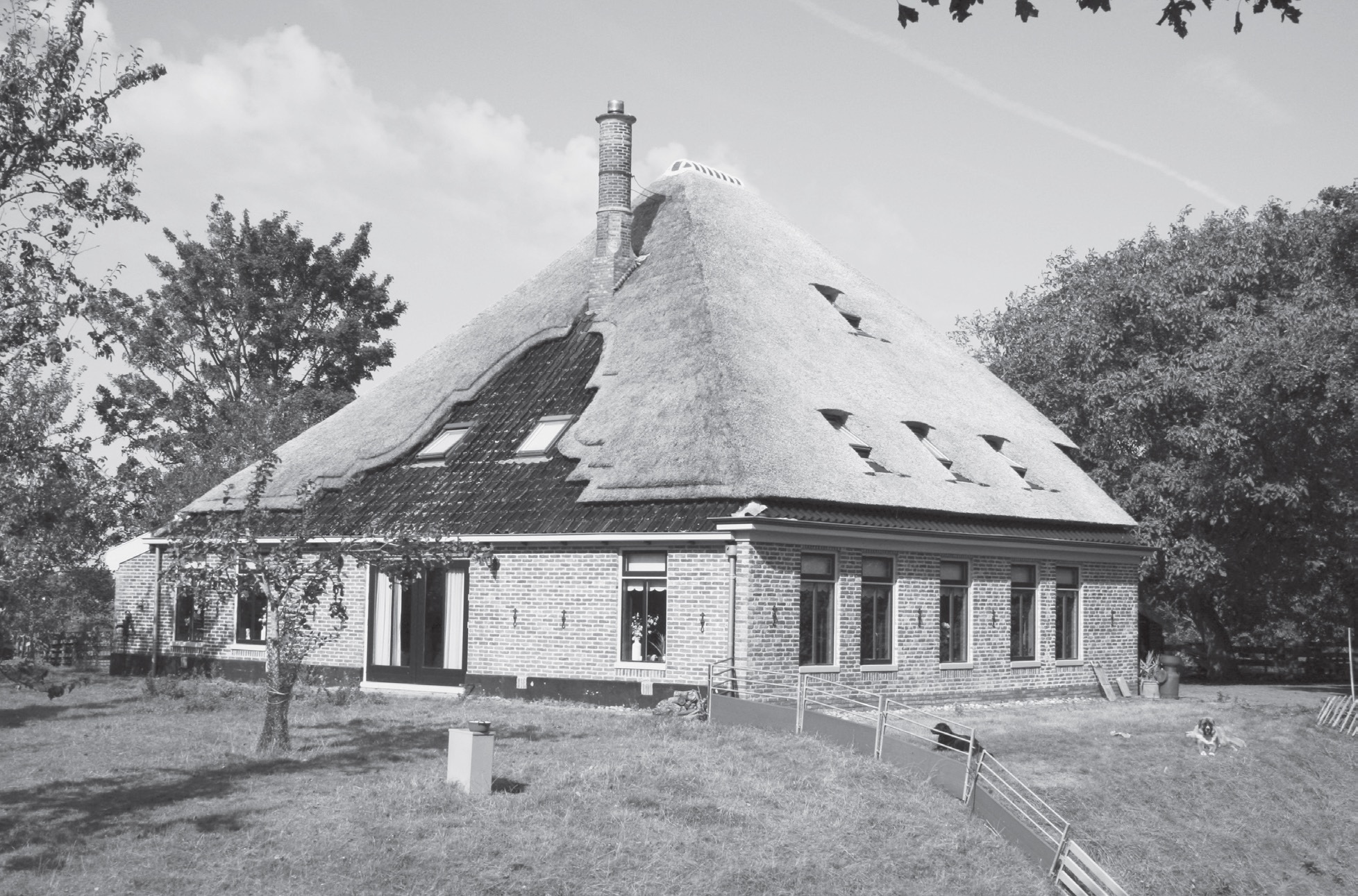 voor het waterdicht maken kan men met pannen beter aansluiten op de schoorsteen dan met riet. Door het van beneden naar boven dekken met riet, wordt het onder de schoorsteen zo kort dat het niet meer vastgezet kan worden. De versierlust hield niet op bij een spiegel met een schoorsteen, maar ging verder met een topgevel, waarvan de windveren versierd werden met verfijnd houtsnijwerk met talrijke ranken. Soms was het een klokgeveltje, waar weer ornamenten bovenop werden gezet.