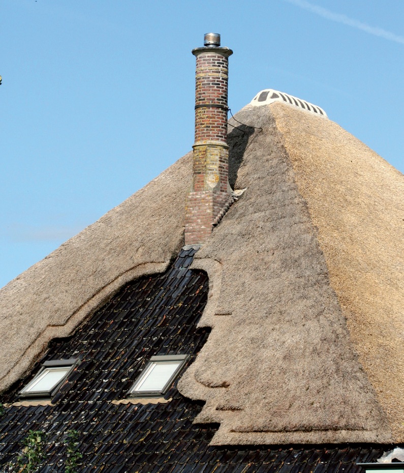 Met een dak kun je indruk maken, bijvoorbeeld met de zogeheten spiegel. Dat is een driehoekige uitsparing in het rieten dak, waarbij in de driehoek het dak wordt gedekt met pannen. Het riet kan eenvoudig rechthoekig, trapsgewijs terugspringen, maar ook met sierlijke vormen. De schoorsteen staat vaak bovenin de spiegel. Dat staat niet alleen mooi, de reden is vaak ook heel praktisch: