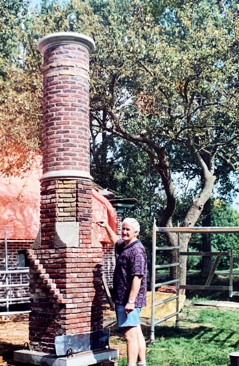 Een paar jaar geleden kwamen mijn buren, Ruud en Mariska Knijn van Gouwe 51, bij me langs met het verzoek of ik wilde helpen om een ronde schoorsteen op te metselen. Hun oude schoorsteen was van zeer slechte kwaliteit. Ruud had een schoorsteen in betere staat opgekocht uit een gesloopte boerderij. Ik was al een tijdje met pensioen en ik was altijd al gecharmeerd van ronde schoorstenen. Ik vond het een mooie uitdaging om mijn oude vak van metselaar weer eens uit te leven.