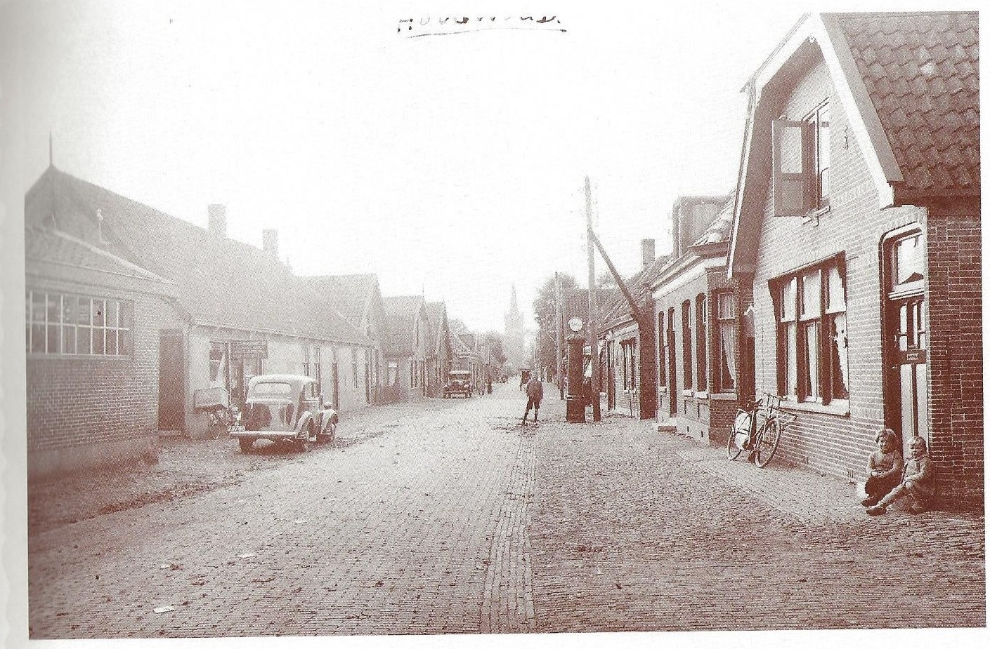 Aan de linkerkant staat de schilderswerkplaats van Breed die zich achter café ‘De Witte Valk’ bevond. Daarnaast bij het uithangbord de kruidenierszaak van Cees Commandeur ‘De Rijstvogel’.