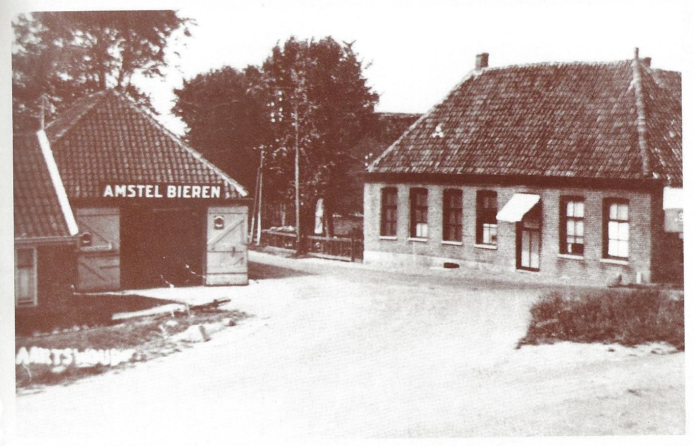 Links het huisje van Gerrit Leien, de stoker van het stoomgemaal. Daarnaast de doorrijstal van het café, tussen de bomen door de boerderij van Hemke en dan café ‘De Roode Leeuw’. Tevens was hier een kolfbaan waar ook nog uitvoeringen werden gegeven. Dat deden de verenigingen om en om met café de Stompetoren, met name de zang- en toneelverenigingen. Er waren wel twee afzonderlijke nutsverenigingen.
