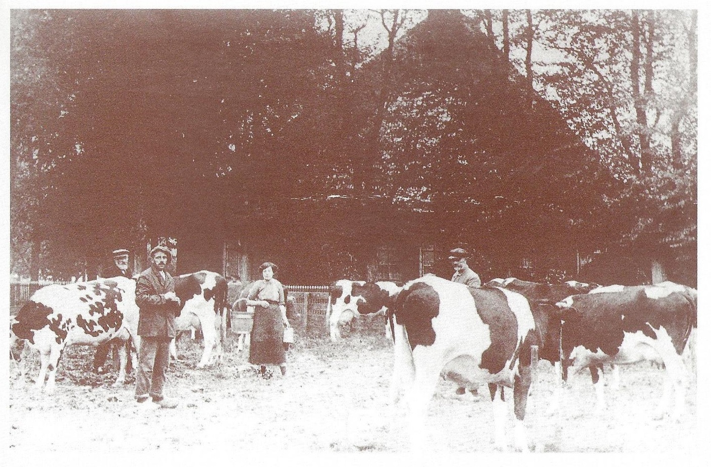Op de foto zien we van links naar rechts: Jan Koorn Dzn, melker Jan Burger, melkster met houten emmer en melkblok Trijntje de Graaf en Jan Schagen.
